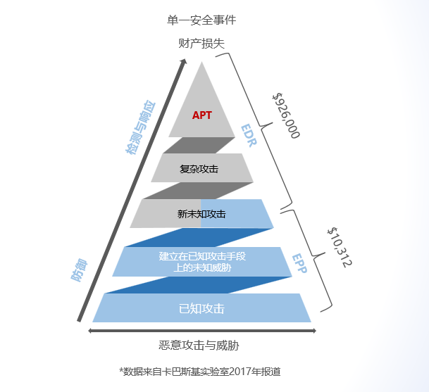 傳統的端點安全防護主要是靠殺毒軟件,通過病毒特征碼匹配進行本地查殺,屬于單機被動防御產品。之后的EPP(端點保護平臺)雖然作為平臺級端點主動防御解決方案并在企業廣泛應用,但該產品還是采用了防御型技術,難以應對復雜攻擊和高級威脅。隨著終端泛在化,未來所有的網絡節點都將是終端,端點安全的關注點,已經從單一安全防御轉移到更注重威脅發現和自動化處置能力,對自動化威脅檢測、響應、處理、運維能力要求越來越高。在此基礎上,EDR應運而生。