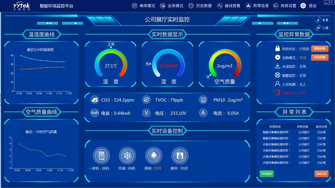 整個檔案館庫房通過接入云涌科技智慧環(huán)控系統(tǒng),采集所有檔案室內的溫度、濕度、漏水、人員侵入等數據,以便更好地通過自動或手動模式控制空調、除濕加濕凈化一體機、電動窗簾、燈光等智能設備,從而達到調節(jié)溫濕度及空氣凈化的目的;除此之外,智慧庫房還通過接入視頻監(jiān)控、門禁,實時掌握庫房人員進出情況,保證庫房內資料安全。
