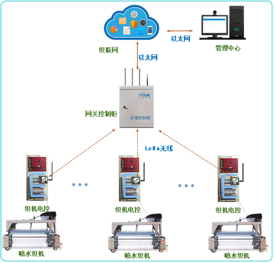 首先,工廠內的各個終端節點(我們稱之為“織機電控“)集成LoRa 模組,使設備、傳感器具備無線傳輸能力,實現對生產數據的實時上報和操作指令的接收,一旦工業攝像頭通過AI算法識別到織機故障,便可通過LoRa模組及時上傳告警信息。然后,LoRa智能無線網關對這些終端節點的數據再進行采集、分析和處理,并上傳到織聯網平臺,最后,機器效率、產量和告警信息等一系列內容就會通過大屏展示,及時提醒管理人員進行設備故障處理。