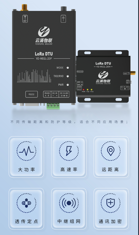 LoRa DTU:帶有RS485/232接口(綠端子/標準DB9),分為基礎款、增強款和工業款,不同傳輸距離和防護等級,適合不同應用場景;