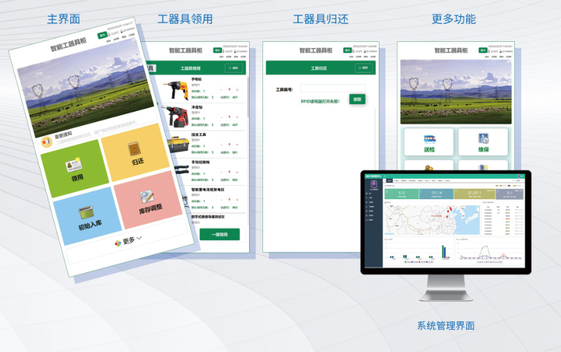 智能工器具管理系統(tǒng)是針對供電所普通工器具和安全類工器具管理的一整套解決方案。根據(jù)存儲工具的環(huán)境要求不同,設(shè)置不同的存儲柜和管理方式。系統(tǒng)采用RFID標(biāo)簽對工具進行識別和管理,通過智能工具柜的標(biāo)簽識別和智能控制,完成工具使用過程中的自助借還、領(lǐng)用引導(dǎo)、錯誤提醒以及自動盤點等功能。